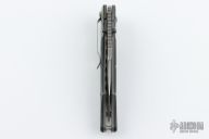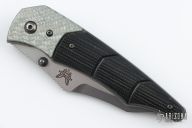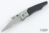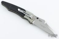 This First Production Snody Design folder features a tumbled wharncliffe style blade with partial serrations, dual thumb-studs and a notched thumb-rest. The handle has silver twill bolsters and black G-10 scales, with bead blasted titanium liners and stainless steel posts. Has a stonewashed stainless steel clip, tip down carry. Nice detent, lockup and blade seating. Includes the original box and papers. First Production 0331/1000. Has some scratches and has been resharpened, otherwise good condition.
