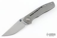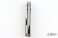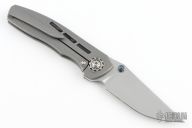 This Dukling by Kody Eutsler features a tumble finished blade with dual Black Timascus thumbstuds. The handle has a milled, stonewashed titanium frame with matching backspacer and tip up clip with hidden screws. Rides on bearings, nice detent, lockup and blade seating. Comes with original box and COA. Excellent condition.