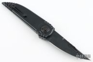 This Phoenix model sports a black handle with a phoenix laser etching and a CPM-S30V steel blade with a black cerakote finish. The top edge of the knife has been sharpened.