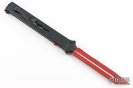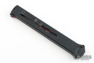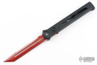 Joining the Estiletto OTF lineup is this fantastic model with a USA cutout on the black anodized aluminum body with black hardware/clip and a red coated dagger blade with partially serrated top edge.