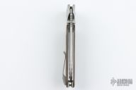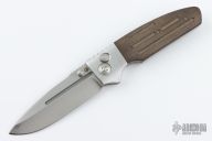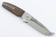 This custom button lock folder features a satin finish blade with dual thumb studs. The handle satin finished stainless steel bolsters and liners, green micarta scales, and a tip up bead blasted stainless steel pocket clip. Notched thumb rest on blade spine and handle. Strong lock up, nice detent and blade seating is dead center. Includes the original box.  Nice detent lock up and blade seating.  Excellent Condition.