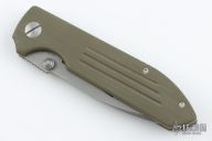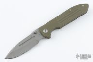 This Dauntless MK3 by T.A.D. Gear features a stone wash finished spear point blade with swedge, fullers, dual thumb studs and notched thumb rest. The handle has a milled and OD green G10 "A" side and stone wash titanium lock side over a notched black G10 backspacer. The bead blasted titanium deep carry clip is positioned for right hand, tip up carry. Includes the original box.  Excellent Condition.