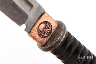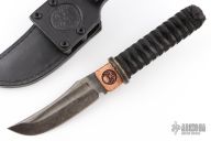 This One Off Custom Combat #2 by Ankura Knife Co features an apocalyptic finished 8670 steel blade with fullers and a false top edge, .191" blade stock and 1.344" blade depth, hidden tang construction. The handle has a carved copper habiki, carved brass and leather tuba, black leather wrap over black stingray skin. Comes with a hand tooled black leather sheath and a COA dated 6/17/24. Excellent condition.
