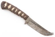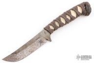 This Goshi by Ankura Knife Co features an apocalyptic finished blade with .191" blade stock and .903" blade depth, hidden tang construction. The handle has brown cord wrap over white stingray skin. Comes with a COA dated 3/15/24. Excellent condition.