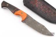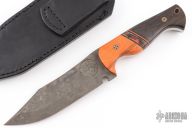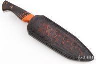 This Cobra by Ankura Knife Co features an apocalyptic finished blade with false top edge, .187" blade stock and 1.618" blade depth, full tang construction. The handle has orange wood bolsters, bog oak scales, black/orange/acrylic spacers, white liners, mosaic pins. Comes with a hand tooled brown leather sheath, challenge coin and a COA dated 4/15/24. Excellent condition.