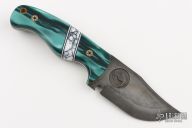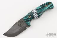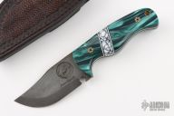 This Sabertooth Prototype by Ankura Knife Co features a vintage rubbed blade with false top edge, .115" blade stock and 1.487" blade depth, full tang construction. The handle has kirinite scales, black/white/stone spacers, white liners, mosaic pins. Comes with a hand tooled brown leather sheath, challenge coin and a COA dated 4/10/24. Excellent condition.