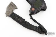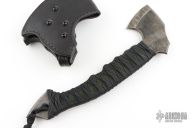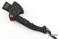 This Blackhawk by Ankura Knife Co features an apocalyptic finished blade with .261" blade stock and 2.75" blade depth, full tang construction. The handle has black cord wrap over green stingray skin and a brass menuki. Comes with a black leather sheath with green stingray skin inlay, and a COA dated 5/28/24. Excellent condition.