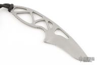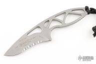 This Medallion neck knife has a bead blasted partially serrated blade with notched thumbrest, .157" blade stock and 1.299" blade depth, full skeletonized tang construction. Dated 07/2001 and s/n 0189. Comes in an unlabeled MT box. Has some light scuffs and scratches, great condition otherwise.