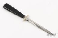 This Dagger by Pat Crawford features a mirror finished double edged blade with .170" blade stock and .416" blade depth, hidden tang construction. The handle has a nickel silver guard and black linen micarta grip with black and white spacers. Has a couple light scratches, otherwise excellent condition. Comes with a zippered case.
