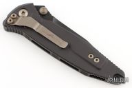This Signature Series Socom Elite manual linerlock folder by Microtech Knives has a black DLC blade with notched thumbrest and dual thumbstuds. Has a black aluminum handle with non-slip inlays, tip down blasted stainless steel clip. Serial number 828 and dated 01/2019. Comes with Microtech box (Label says 160A-1DLCSS it is 160-1DLCSS) and papers. Has a couple light scuffs, excellent condition otherwise.