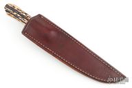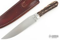 This Knife by Master Smith PJ Tomes features a hand rub satin finished blade, .154" blade stock and 1.378" blade depth, full tapered tang construction. The handle has stainless steel bolsters and stag scales. Comes with a leather brown leather sheath with belt loop. The scales have separated from the tang a little at the butt, otherwise excellent condition.