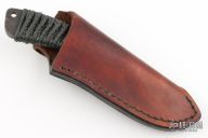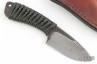 This knife from Matt Lamey features a forge finished blade with swedge and hamon, .241" blade stock and 1.352" blade depth, full tang construction. The handle is comprised of epoxied cord wrap. Lanyard hole in pommel. Includes a brown leather sheath. Excellent condition.