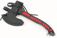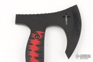 This Viking Hawk by Half Face Blades features a cerakote blade with hammer pole at the rear, textured spine, .220" blade stock, full tang construction. The handle has red/black G-10 scales. Comes with a kydex sheath. Excellent condition.