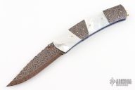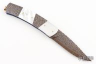 This knife by Johan Gustafsson features a colored Multi-Bar Mosaic Damascus blade with a single gold thumbstud with sapphire inset, fileworked spine. The handle has matching Mosaic Damascus and mother of pearl scales, gold plated screws and an gold lanyard bail, fileworked and anodized titanium liners, Damascus backspacer with 8 sapphires set in gold bezels. Makers name is engraved inside backspacer. Nice blade seating and lockup. Comes with a Velcro case. Excellent condition.