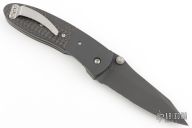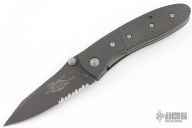 This Lightfoot LCC D/A side opener by Microtech has a black partially serrated blade, black titanium bolsters, and carbon fiber scales. Stainless steel clip and liners. Dated 09/2002 and #7962. Comes with original box, papers, and nylon sheath. Has a couple light scuffs, otherwise excellent condition.