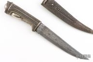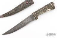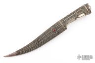 This Persian Fighter by Zaza Revishvili features a 3-Bar mosaic Damascus blade with fluted ricasso, and carved spine, .260" blade stock and 1.286" blade depth, hidden tang construction. The handle has a silver frame with sterling silver overlays done by Zaza Revishvili. The handle and the scabbard match. Excellent condition. Comes with zippered case. Amazing detail! True work of art that could be the corner stone of any collection!