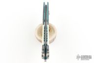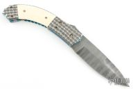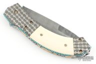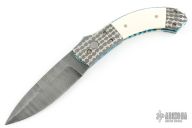 This Linerlock Auto by Frank Potter features a Damascus blade with false top edge. The handle has interesting Damascus bolsters, Damascus button, mammoth ivory scales, fileworked screws, fileworked and anodized titanium liners, fileworked and stippled stainless steel backspacer with gold setting inlays with diamond insets. Nice action, lockup and blade seating. Comes with a zippered case. Excellent condition.