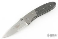 This Lightfoot LCC D/A side opener by Microtech has a stonewashed partially serrated blade, aluminum bolsters, and carbon fiber scales. Stainless steel clip and liners. Dated 11/2000 and #1484. Includes Lightfoot MT nylon belt sheath and zipper case. Hasscuffs and scratches, has a chip in the carbon fiber, and and two screws are mis-matched. Good Condition.