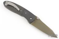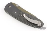 This Lightfoot LCC D/A side opener by Microtech has a green blade, black aluminum bolsters, and carbon fiber scales. Stainless steel clip and liners. Dated 12/2002 and #8881. Comes with a Lightfoot MT nylon belt sheath, and zipper case. Has a couple light scuffs, excellent condition otherwise.
