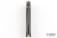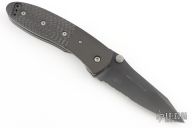 This Lightfoot LCC D/A side opener by Microtech has a black partially serrated blade, black aluminum bolsters, and carbon fiber scales. Stainless steel clip (not attached) and liners. Dated 01/2001 and #3614. Comes with a MT nylon belt sheath, and zipper case. Has a couple light scuffs, excellent condition otherwise.