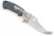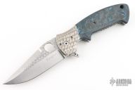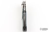 This Kasper Flipper by Crawford Knives features a satin finished blade with jeweled flats, fileworked spine, flipper and a thumbhole. The handle has dovetailed jeweled titanium bolsters, Aqua Blue carbon fiber scales, titanium liners with jeweled interiors and fileworked edges, matching carbon fiber backspacer, tip down jeweled titanium clip with fileworked edges. Nice detent, lockup and blade seating. Comes with a zippered case. New from maker.