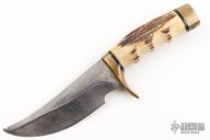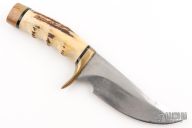 This Skinner by Clyde Fischer features a satin finished blade, .243" blade stock and 1.740" blade depth, hidden tang construction. The handle has a brass guard and butt and a stag grip with finger grooves and black spacers. Has scuffs and scratches, has patina, has been used and resharpened, otherwise good condition for its age.