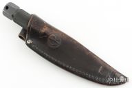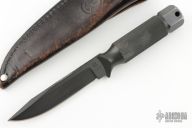 This Mountaineer by Chris Reeve Knives features a black coated blade with notched thumbrest that is .188" thick and .830" deep, integral construction. The handle is knurled and has a removable butt cap. Comes with 2 Reeve black leather sheaths. #303 on blade and Made in South Africa. Has some scratches and wear on the finish, otherwise good condition.
