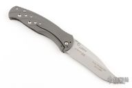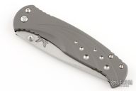 The Subrosa is a collaboration project between Ken Steigerwalt and Matt Lerch. They have patent pending status on this mechanism. They sold the manufacturing rights to Benchmade, who produces factory versions utilizing this mechanism. The key elements that make this assisted mechanism a cut above are the two titanium leaf springs connected together with a hardened roller that engages on the blade. Because the roller follows the blade during the opening and closing motion, there is little to no wear to the components. Tumble finished S30V stainless steel drop point blade with single thumb stud. Milled titanium frame with titanium barrel-type spacers, and bead blasted stainless steel tip down clip (not attached). Comes with original box, drawstring pouch and papers. First Production #261/1000. Has a couple light scuffs, excellent condition otherwise.