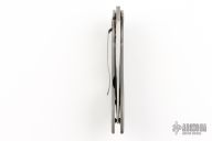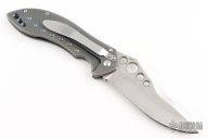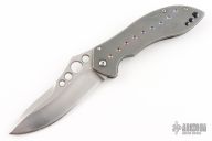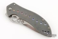 This 630 Skirmish is a Neil Blackwood design executed by Benchmade. It features a recurve tumble finished drop point recurve blade with thumb hole and notched thumb rest. The handle is comprised of a bead blasted and anodized frame with drilled and anodized accents over titanium barrel spacers. The tumbled steel pocket clip is positioned for right hand, tip down carry. Has scuffs, and scratches throughout. Has been resharpened. Comes with a zipper case. Fair condition.