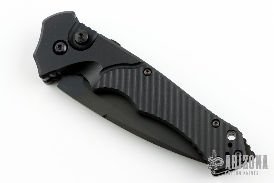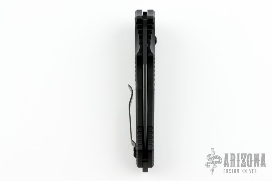 This Rukus II by Benchmade features a black blade with false top edge. The handle has a black aluminum frame with a black stainless steel tip up clip (not attached). Has a safety. Comes with original box. Has some light scuffs, great condition otherwise.