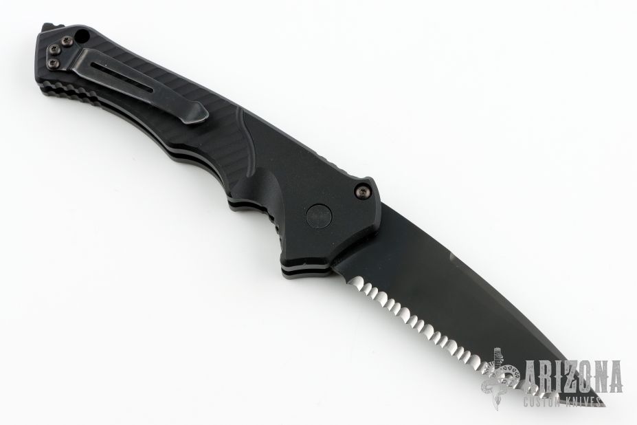 This knife has a custom DLC finished blade and handle. It was professionally resharpened with serrations.