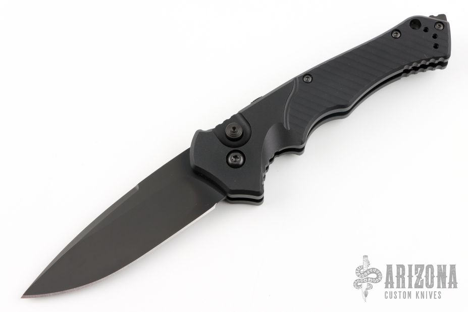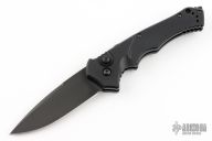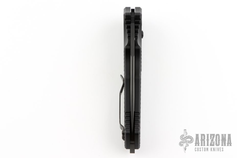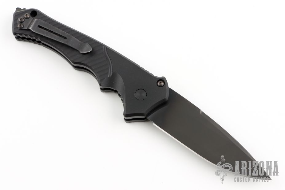 This Rukus II by Benchmade features a black blade with false top edge. The handle has a black aluminum frame with a black stainless steel tip up clip (not attached). Has a safety. Comes with original box. Has some light scuffs, great condition otherwise.