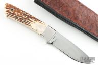 This hunter from Ferenc Tumpek features a mirror polished blade with fileworked spine and notched thumbrest, .154" blade stock and 1.103" blade depth, full tapered tang construction. The handle has stainless steel bolsters and stag scales with stainless pins over black liners, lanyard hole at the butt, fileworked tang. Comes with a brown leather sheath with exotic hide inlays. Excellent condition.