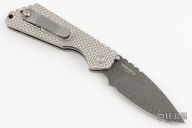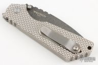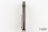 This Pro-Strider SnG is a collaborative effort between Pro-Tech and Strider Knives. It features a drop point Chad Nichols Damascus blade with a notched thumbrest. The handle is comprised of a checkered titanium frame with tumbled titanium tip up clip. Black Lip Pearl push button and ramped sliding safety on handle. Lanyard hole in pommel. Includes original box and paperwork. Excellent condition.