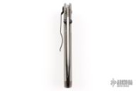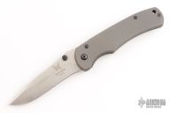 This Benchmade 750 Pinnacle features a satin finished, recurved drop point blade with swedge, single thumbstud and notched thumb ramp. The handle is comprised of a bead blasted titanium frame over a notched black FRN backspacer. Lanyard hole in pommel and black coated, tip down steel clip. Comes in a zipper case. Has some scuffs and scratches, great condition otherwise.