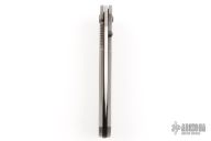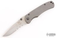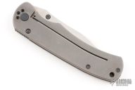 This Benchmade 750 Pinnacle features a satin finished, partially serrated recurved drop point blade with swedge, single thumbstud and notched thumb ramp. The handle is comprised of a bead blasted titanium frame over a notched black FRN backspacer. Lanyard hole in pommel and black coated, tip down steel clip (not attached). Comes in a zipper case. Has some scuffs and scratches throughout, good user condition.