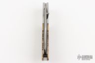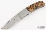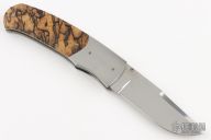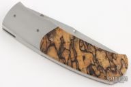 This linerlock folder is a collaboration between John Young and Bill Ankrom features a hand-rubbed satin finish blade with single thumbstud. The handle has hand rub satin finished stainless bolsters, spalted hackberry scales with black liners, titanium liners, stainless steel backspacer. Smooth action, nice detent, blade seating and lockup. Outstanding fit and finish. Young's mark is on the blade and Ankrom's is on the interior. Comes with a stingray skin zippered case. Has a couple light scratches on the bolsters, otherwise excellent condition.