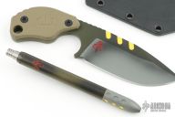 In 1988, he began making specialized knives for use by the military. This turned out to be fortunate turn of events, both for Mick and for the knife using world at large. Mick’s approach was to not get burdened by the weight of past designs. He started with a tabula rasa, a clean slate, informed only by his own experiences and knowledge of what a soldier needed in a knife. The knives he made didn’t look like the hunter-inspired knives seen in most PXs; instead they were almost brutish in their functionality: beefy, solid, and with unbreakable ¼” stock full tangs. These knives were the first indication of his innovative approach: in addition to their utilitarian design, the knives carried a subdued finish and subdued sheaths. No one carrying a Strider knife was going to be spotted because of sunlight glinting off of polished steel or a glossy leather sheath. Soldiers, policemen, and other men going into harm’s way couldn’t buy them fast enough. Mick sampled some good ideas, but made them great. For instance, he was not the first to wrap a knife handle with paracord, but he was the first to do it in a way that was tough enough for sustained infantry use. His knife line grew over the following years to include different varieties of fixed blades, all distinctive and many with specialized uses. But constant in all of them was a disregard for convention, and a desire to try new ideas. An example of this was the Ajax – it featured a very wide blade surface clearly designed to inflict damage. It drew on the weapons carried by Roman legionnaires, yet was modern and usable in the 21stCentury battlefield. Mick also worked on his technical skills, always striving to become better at the physical craft. At the 2002 Blade Show, a group of the best tactical knifemakers in the country decided to compete with each other to produce the most innovative and interesting fixed “battle blade” at the show. Mick’s entry, an incredible integral knife made out of ½” titanium stock with a zippered composite blade, gorgeous handles, and integral guard was the unanimous winner, and effectively retired the competition.