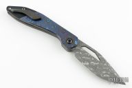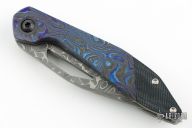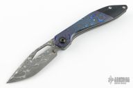 This Wolfhound by Keanison Knives features a Chad Nichols Intrepid XHP core San Mai Damascus blade with thumbhole. The handle has ZircuTi scales with zirconium pivot collars, black canvas micarta rear bolsters, blasted titanium liners, zirconium backspacer, and a tip up zirconium clip with hidden screws. Rides on Skiff bearings, nice detent, lockup and blade seating. Comes with original box and COA dated 6-4-24. Excellent condition.