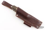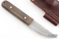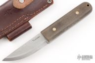 This knife by LT Wright features a satin finished scandi ground blade with .121" blade stock and 1.063" blade depth, full tang construction. The handle has green micarta scales with brass/stainless pins. Comes with a brown leather sheath and original box. Has some patina, and a couple of rolls in the blade edge. Otherwise excellent condition.