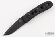 This is a Woodard Knives Fer De Lance side opening automatic with a black coated blade and black aluminum frame. Stainless steel clip, tip up carry. Excellent condition. Comes with original box and nylon sheath.