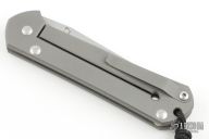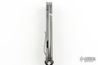 This Original Large Sebenza by Chris Reeves features a mirror polished clip point blade with single thumb stud and notched thumbrest. The handle has a bead blasted titanium frame over a single barrel spacer. Lanyard hole with lanyard in pommel, tip up clip.