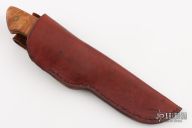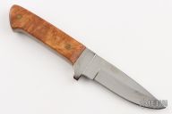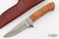 This knife by R Eves features a mirror finished blade with .150" blade stock and .989" blade depth, full tang construction. The handle has stainless steel bolsters with maple burl scales. Comes with a brown leather sheath. Has some light scratches, otherwise excellent condition.