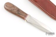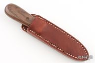 This Model 24 Guardian by Randall Made Knives features a double edged satin finished blade with notched thumb and finger rests, .162" blade stock and .980" blade depth, hidden tang construction. The handle has a nickel silver guard, walnut grip and red/white/blue spacers. Comes with a brown leather boot sheath, original paper wrapping and sharpening stone. Comes with two Randall Patches and a Randall pin. New from maker.