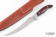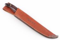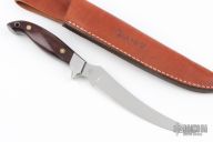 This Fish Hawk by Lakota was produced by Moki. It features a satin finished blade with .086" blade stock and 1.030" blade depth, full tang construction. The handle has stainless steel bolsters, rosewood scales. Comes with a brown leather sheath and original box. Excellent condition.