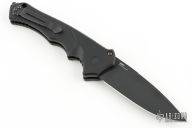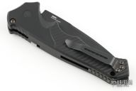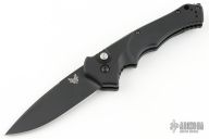 This Rukus II by Benchmade features a black blade with false top edge. The handle has a black aluminum frame with a black stainless steel tip up clip. Has a safety. Excellent condition.
