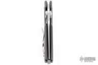 This MSG-2 by Marfione Custom Knives features a double vapor blast finished blade with satin flats, false top edge, notched thumbrest and dual titanium thumbstuds. The handle has a black aluminum frame with blasted hardware and tip up stainless steel clip, blasted titanium backspacer with lanyard hole. Comes with nylon zippered case, original box and papers. Excellent condition. #014 and dated 12/2016.