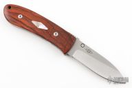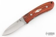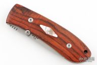This DK-FHL linerlock folder by Dozier Knives has a satin finished D2 stainless steel drop point blade with notched thumbrest and single thumbstud. Handle is has cocobolo scales with mother of pearl escutcheons, titanium liners and backspacer. New from maker!