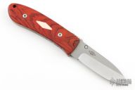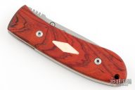 This DK-FHL linerlock folder by Dozier Knives has a satin finished D2 stainless steel drop point blade with a notched thumbrest and a single thumbstud. Handle has cocobolo scales with mammoth ivory escutcheons, titanium liners and backspacer. New from maker!