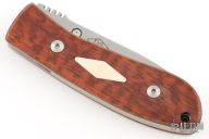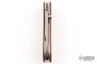This DK-FH linerlock folder by Dozier Knives has a satin finished D2 stainless steel drop point blade with a notched thumbrest and a single thumbstud. Handle has snakewood scales with mammoth ivory escutcheons, titanium liners and backspacer. New from maker!